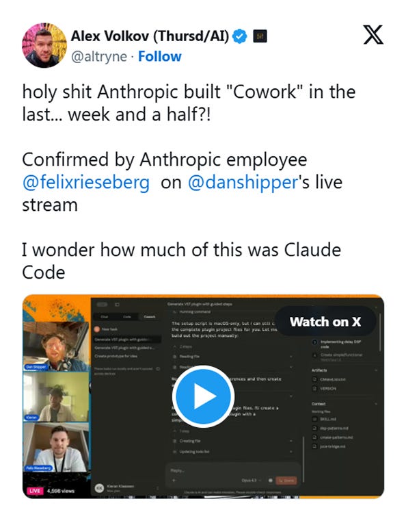 Anthropic engineer Felix said Cowork was built in ~10 days, and much of it was written by Claude Code itself.