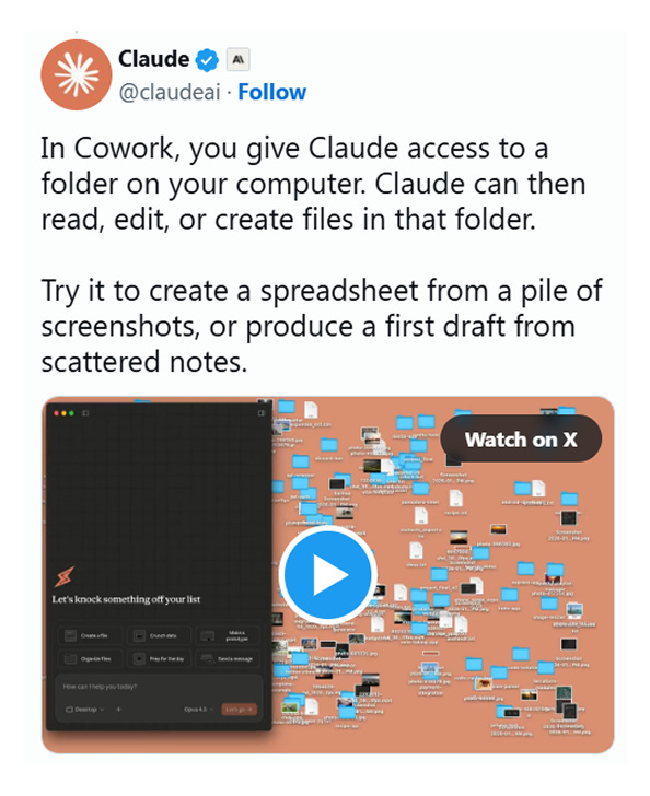 Anthropic's demo video showed Cowork cleaning up a messy desktop: sorting files by type, creating folders, renaming things logically.