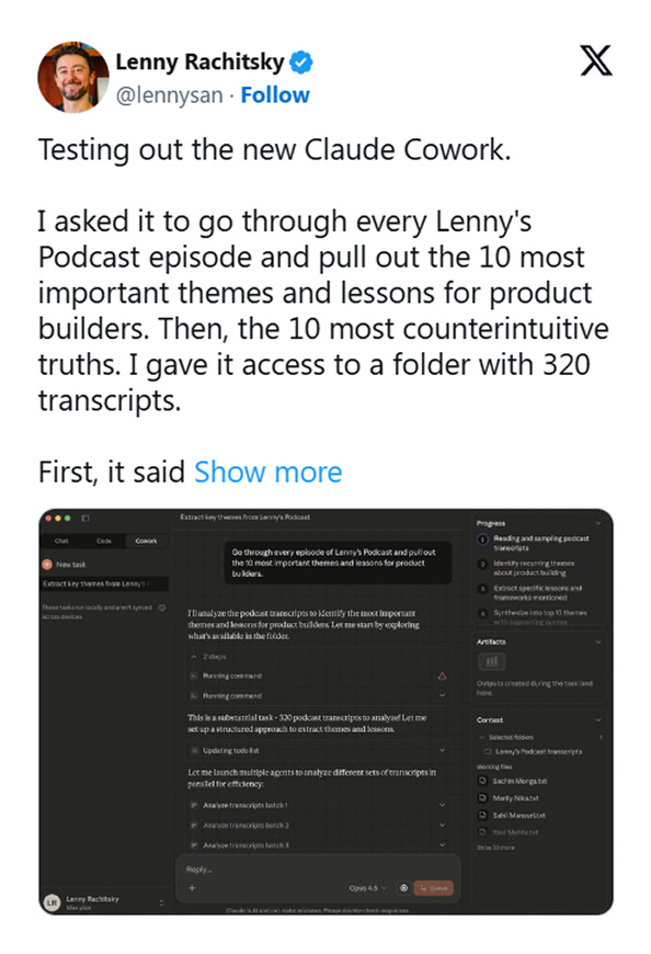 Lenny gave Cowork a folder with 320 podcast transcripts. asked it to extract: