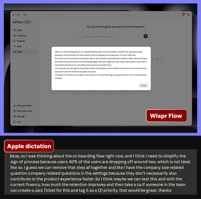 Why alternatives didn’t work: Apple’s dictation is a nightmare. It has constant errors, no punctuation, and requires heavy cleanup. Other tools had similar accuracy issues.