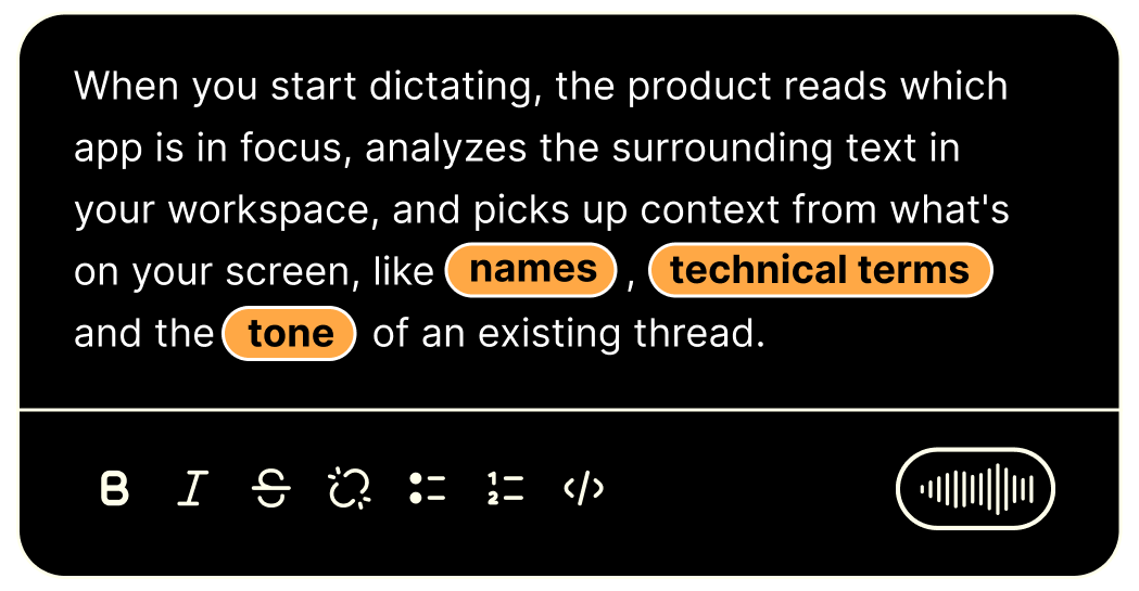 So the same thought, spoken into Slack, comes out casual, and spoken into an email draft to a client, it comes out structured and professional.
